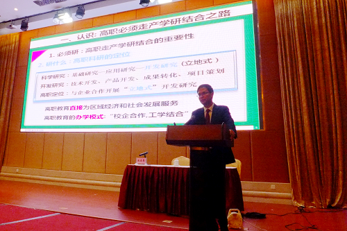丁金昌院长在研讨会上作《以产学研基地为平台——来自高职的探索》的专题报告。报告分析了高等职业教育必须走产学研之路的原因,结合我院近些年来走产学研结合之路的探索经验,深入阐述了高等职业教育如何走产学研结合之路的策略和路径,赢得了参会代表的阵阵掌声。