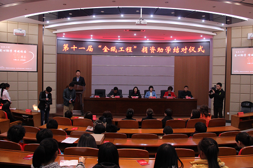在结对仪式上,人文传播系郑国波书记致欢迎辞并深情回顾了“金瓯工程”十年助学,真诚感人、成就喜人、精神励人,表示将继续通过“大爱人文,心怀感恩”的校园文化,把“爱”与“感恩”为核心理念的“金瓯工程”精神传承下去,来培养大学生奋发向上、积极进取的生活态度,激发他们挑战困难的勇气,使他们学会感恩,懂得爱,促进学生成长成才。学生代表黄谢谢同学也满怀着感激之情表达了受助学生的心声“脚踏实地,努力取得成绩,回报帮助我们的人”。学院王向红副院长、叶吉波处长给各女企业家颁发了荣誉证书,王向红副院长希望受资助同学珍惜社会给予的关怀,感恩爱心人士的奉献,全身心投入到今后的学习工作中去。在结对仪式中,女企业家与结对同学亲密交流,鼓励她们“不要因为贫困而放弃学业,因为社会的温暖一直在身边”。