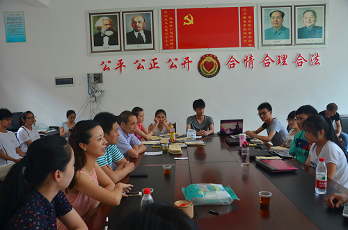 作为财会系2014年暑期社会实践最具特色的队伍之一,枫林暑期社会实践队一直受到学院和地方政府领导的重视。7月17日下午,学院党委委员、副院长王向红教授、学生处副处长吴冰、财会系党总支书记谢肖力和学工办主任马德龙一行到永嘉县枫林镇看望实践队学生。枫林镇镇长林杰、副书记金文达、王渊、县委办政策研究室副主任胡文显在此时也亲切慰问了实践学生,院地领导在枫林镇孤山社区服务中心会议室里开展了座谈会。