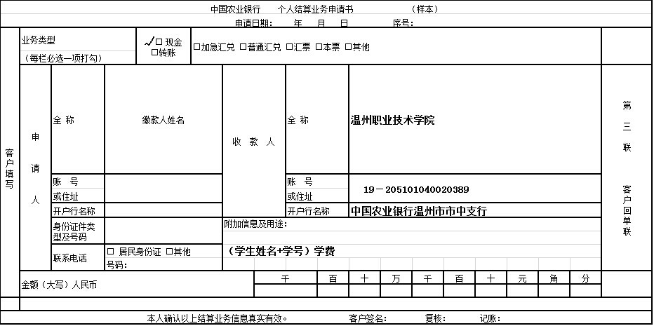 此方式针对省外缴费(在省外缴费的浙江籍学生照此办理)的学生。在各地农业银行营业储蓄网点,同学在填写电汇凭证(个人结算业务申请书)时务必在“附加信息及用途”上注明本人姓名及学号(八位号学号)。请参照以下“样本”填写有关栏目