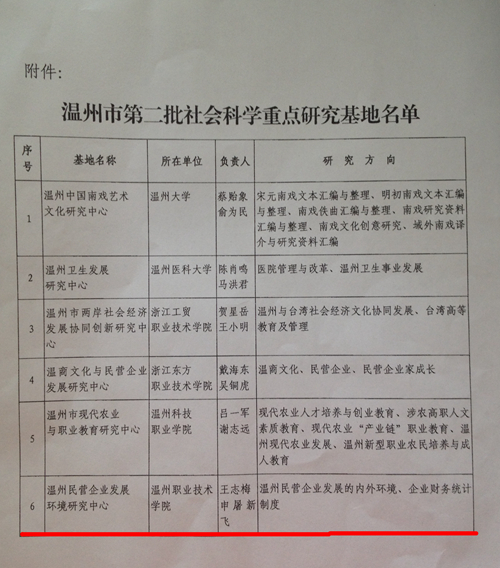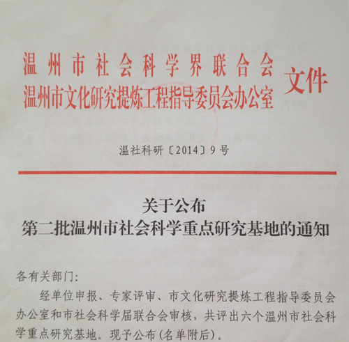 据温州市社科联“温社科研[2014]9号”文件通知,我院“温州民营企业发展环境研究中心”经过专家评审、市社科联审核后,被列为温州市第二批社会科学重点研究基地。 本中心主要研究地方财政税收政策、金融政策、会计制度对民营企业发展的影响,探索、建立一套能够反映温州民营企业发展环境变化情况的指数,为温州市相关部门决策提供依据。