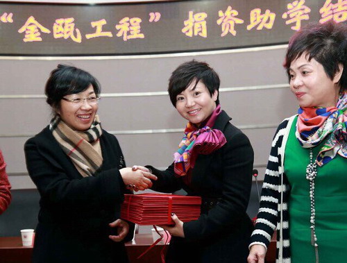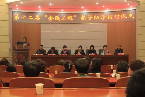 “金瓯工程”是鹿城区妇联、鹿城区女企业家协会为解决贫困女大学生的学习、生活而以结对形式进行的扶贫助学工程。女企业家们以“一对一”的形式对贫困女大学生进行资助,每人每年2000元,连续资助3年,受助对象是家庭贫困、品学兼优的温州职业技术学院人文传播系学子和温州医科大学学子们。到今年已连续举办12届,共资助了855名贫困大学生,资助金额达100多万。