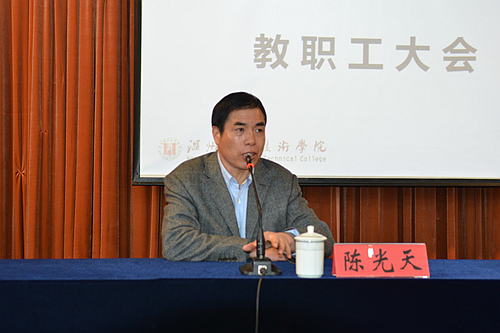 随后,院党委书记陈光天作重要讲话,陈书记要求各系、各部门围绕党委2015年党建工作要点和院长新学期工作布置,加强科学理论武装,推进宣传思想和文化工作;坚持从严管理干部,进一步加强中层领导班子和干部队伍建设;强化基层基础工作,加强基层党组织和党员队伍建设;加强理想信念教育,推进大学生思政教育工作;落实廉政建设责任,把守纪律、讲规矩摆在更加重要的位置;凝聚各方力量,进一步推进校园和谐稳定。望广大教职工用心做事创先争优,圆满完成新学期各项任务。