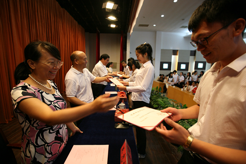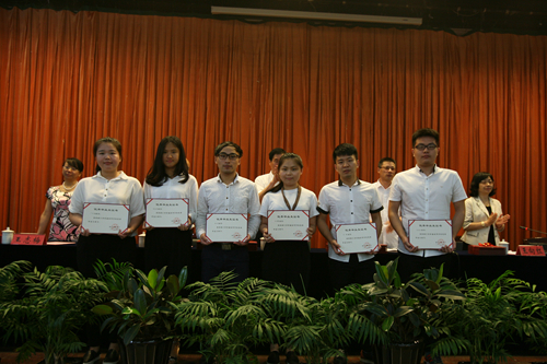 学院党委副书记夏晓军宣读了2015学年国家奖学金获得者、省级优秀毕业生名单。陈光天等院领导一一为国家奖学金获得者以及获得“省级优秀毕业生”称号的同学颁发了荣誉证书,并亲手将毕业证书交给学生代表。