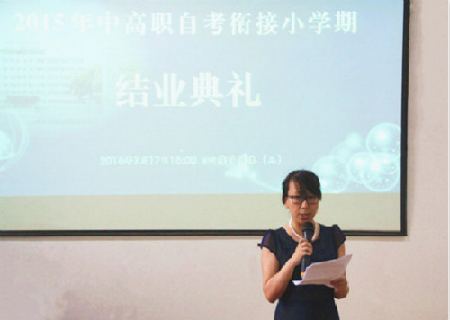 7月17日下午,成教学院隆重举行2015年中高职自考衔接“小学期”结业典礼暨文艺汇演。学院副院长王志梅、成教学院副院长欧阳翰夫、党总支副书记张煜、自考函授部主任朱建敏等出席结业典礼。各班班主任、学工办工作人员、全体小学期学生参加典礼并观看汇演。