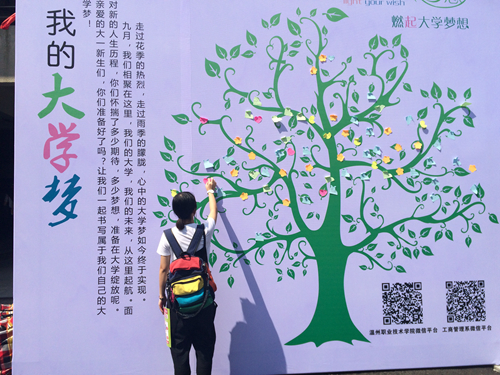 工商系迎新现场特色连连,“‘我自立,我自信’——为独立报到的学妹学弟点个赞”的活动,更好的激发了他们的独立性;2015我的大学梦,点燃梦想树活动,激起他们对大学梦想的向往;由匠心花艺俱乐部精心制作的家校联系卡,给新生送去祝福。同时在系101教室专设了家长休息室,由茶艺俱乐部的学生现场展示功夫茶技,为辛苦的家长献上一杯香醇的茶;系部召开新生家长会,系部领导和各负责人与家长互动交流,加强了家校联系,共促学生健康成长。当天下午,系党总支书记、班主任和辅导员走访了新生寝室,了解新生的入住情况。