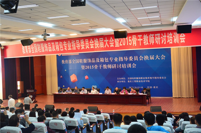 新一届全国纺织服装职业教育教学指导委员会鞋服饰品及箱包专业指导委员会换届大会暨2015骨干教师研讨培训会于2015年10月15日-16日在重庆工贸职业技术学院召开,教育部全国纺织服装行指委主任委员、中国纺织服装教育学会会长倪阳生,重庆市教委高教处处长蒋后强,温州职业技术学院时任党委书记陈光天,重庆工贸职业技术学院院长宋正富教授,中国皮革协会副理事长、浙江省皮革行业协会理事长李伟娟高工,浙江纺织服装职业技术学院副院长杨威教授,全国制鞋标准化技术委员会秘书长戚晓霞高工,重庆服装行业协会陈尚福秘书长等出席本次换届大会。会议由教育部全国纺织服装行指委副主任委员、全国鞋服饰品及箱包专指委主任委员、温州职业技术学院施凯教授主持。来自全国46所本科、专科院校和38家行业企业的专指委委员及列席代表共120余人出席会议。