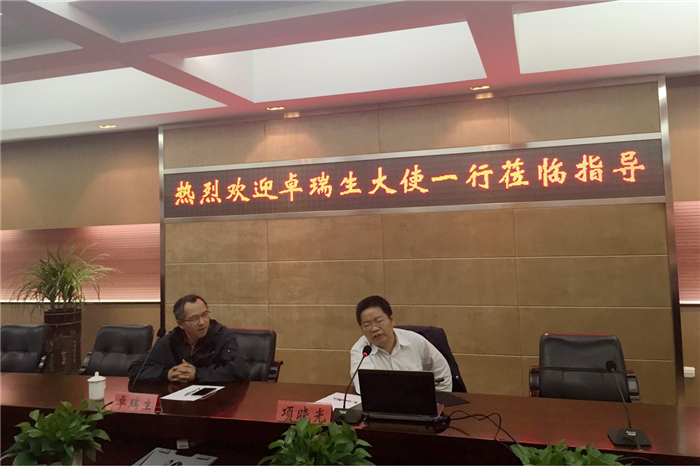 11月1日,中华人民共和国驻布隆迪共和国特命全权大使卓瑞生在法国亚眠高等商学院亚太区主任项晓光的陪同下莅临温州职业技术学院视察工作,学院党委书记王靖高、副院长王志梅热情接待了卓大使一行。