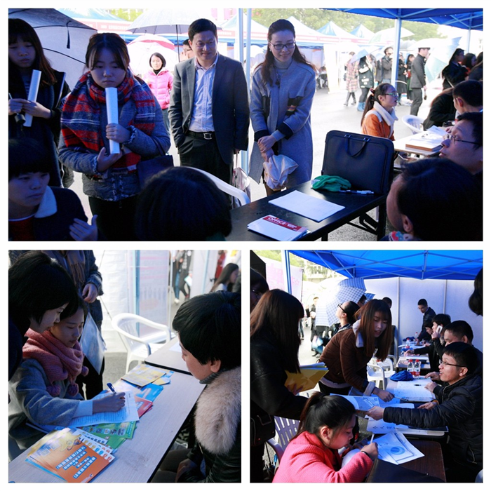 12月9日下午,温州职业技术学院2016届毕业生精选化招聘会在学院明德楼广场举行。来自温州以及上海、南京、杭州、宁波、台州、丽水等周边地市的410家单位参加了招聘会。学院领导王靖高书记、谢志远院长、王向红副院长、王志梅副院长等亲临现场指导。2016届3100多名毕业生到场应聘,4000余名大一大二学生来到现场观摩与寻找实习岗位。