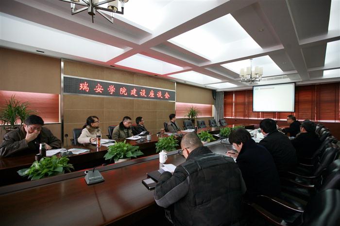 会议就瑞安学院的建设情况作了讨论研究,并敦促瑞安学院建设加快步伐、内外协调、克服困难,务必确保瑞安学院能够如期、顺利投入使用。