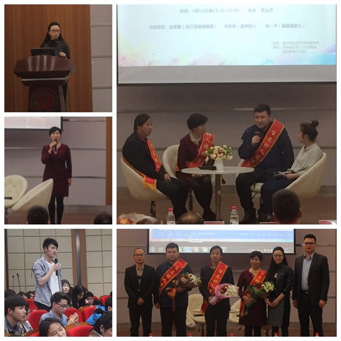 4月13日晚,浙江省道德模范赵章慧、温州好人宋玲华、最美温职人陈一平一同走进温州职业技术学院正德楼罗山厅,参加我院“百名好人进校园、万名师生齐学习”主题教育活动,与师生畅谈诚实守信、助人为乐、文明修身,传递社会正能量,践行社会主义核心价值观。
