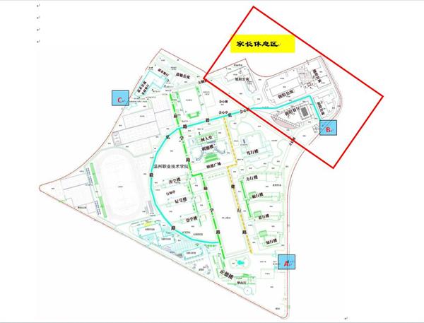 由于今年参加提前招生考生人数较多,为保障考场秩序,学院正门(示意图A标志)仅供考生、考务人员、工作人员进入,家长不得进入校园考试区。家长休息区设学院生活区各食堂,家长可从生活区进出口(示意图B标志,位于中心北路)步行进入家长休息区。