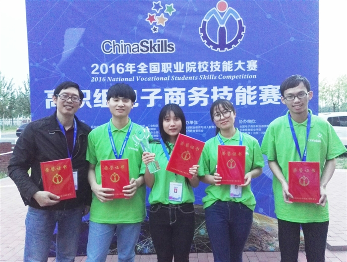 5月13日, 2016年全国职业院校技能大赛高职组“电子商务技能赛项”比赛在天津商务职业学院举行。由我院信息技术系电子商务教研室林来杰、陈国浪老师指导,龚通伟、尚宇杰、许凯、吴佳敏四位学生组成的代表队,凭借扎实的技术、良好的团队合作,经过整整一天的鏖战,最终在全国81支代表队中脱颖而出,以总成绩第3名的优异成绩荣获团体一等奖,林来杰、陈国浪老师荣获优秀指导老师奖。