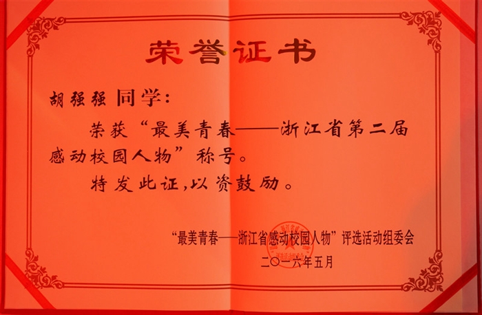 此次“最美青春----浙江省第二届感动校园人物”评选活动由省教育厅、浙江广电集团联合举办,全省高校共推荐55位同学参加初赛,经过初评共选出30位同学入围决赛,经过网络投票、专家投票等评选环节,我院胡强强同学等10名脱颖而出,成功获得“最美青春----浙江省第二届感动校园人物”称号。当选的10名“感动校园人物”来自全省10所高校,他们中有博士、硕士、本科生和专科生,他们是全省百万莘莘学子的杰出代表。