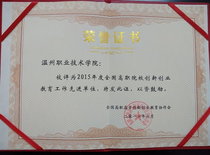 6月2日至4日,全国高职高专创新创业教育协作会2015年年会在山东召开。会议表彰了2015年在创新创业教育方面作出突出贡献的单位,我院荣获“2015年度全国高职院校创新创业教育工作先进单位”称号。