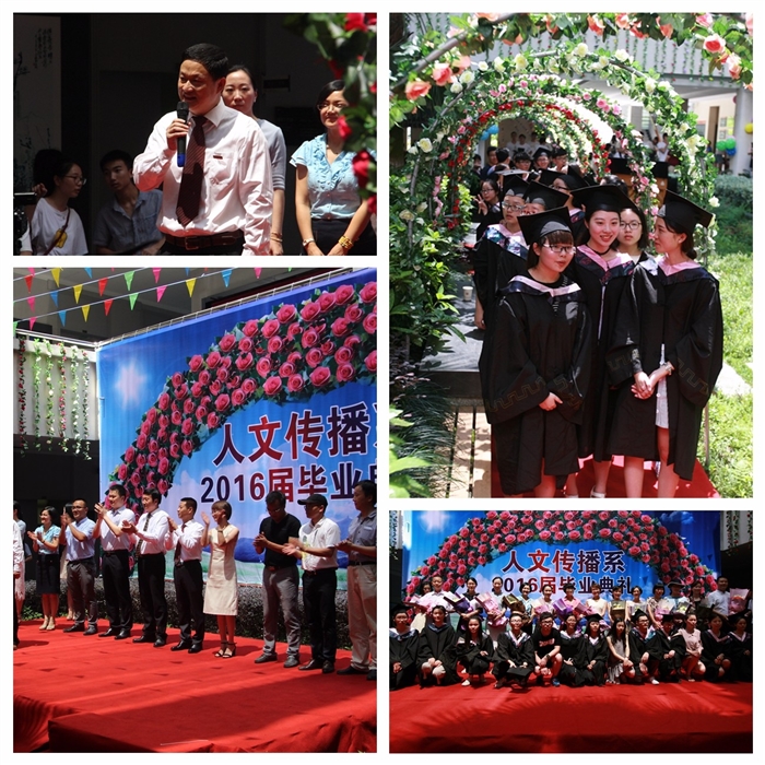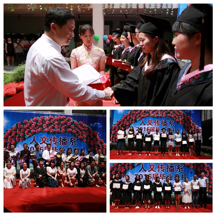 2016年6月22日下午,我院人文传播系2016届学生毕业典礼在知行楼一楼中心花坛隆重举行,一次“婚礼式的毕业典礼”,320名毕业生即将“嫁入社会”。学院院长谢志远、人文传播系主任张宝臣、系党总支书记郑国波等领导,13级各班班主任教师出席了典礼。