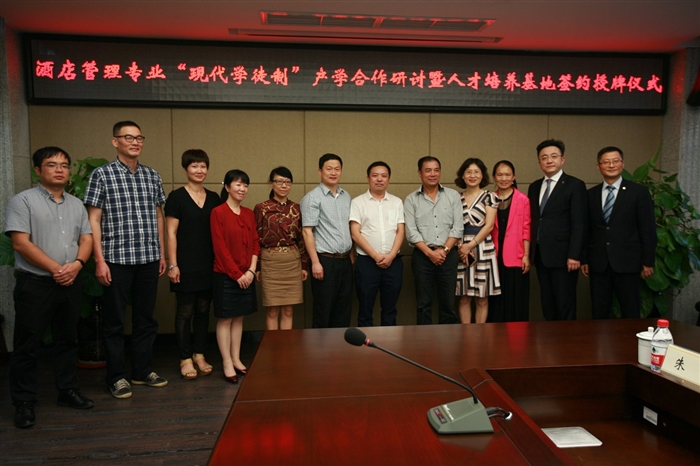 9月28日,温州职业技术学院酒店管理专业“现代学徒制”产学合作研讨暨人才培养基地签约授牌仪式在学院研创大楼三楼会议室隆重举行。我院院长谢志远、副院长王志梅,温州旅游局杨茂富副局长,温州王朝大酒店董事长朱志群、温州喜来登大酒店总经理冷骏、温州滨海大酒店总经理陶珍瑶、温州香格里拉行政副总吴文女士等嘉宾及工商管理系师生代表参加了本次仪式。