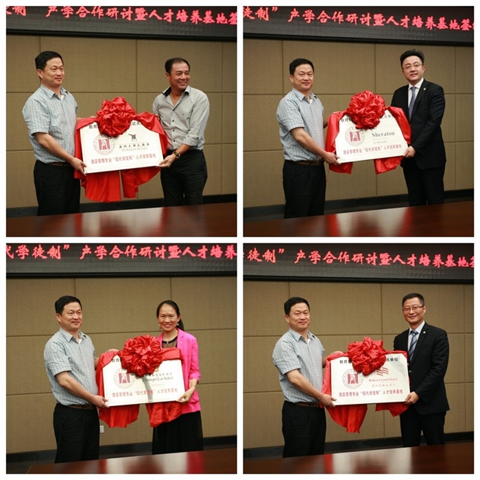 “现代学徒制”人才培养签约授牌仪式上,谢志远院长代表学院分别授牌给王朝大酒店朱志群董事长、喜来登大酒店冷骏总经理、香格里拉大酒店吴文副总经理、滨海大酒店陶珍瑶总经理。王志梅副院长代表学院分别与四位代表签订合作协议。