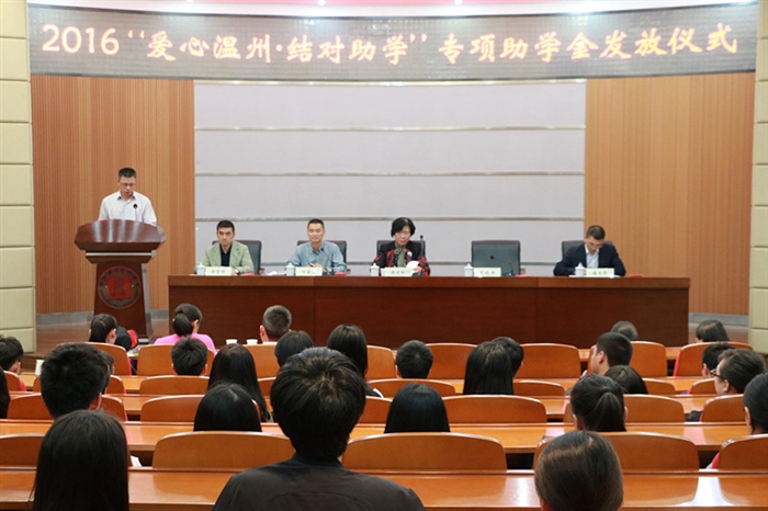 (学生处通讯员 王安琪)11月16日下午,温州市慈善总会、温州烟草公司2016年“爱心温州·结对助学”专项助学金发放仪式在我院正德楼一楼罗山厅举行。我院党委副书记夏晓军、温州市慈善总会副会长周文珍、温州市烟草公司办公室副主任潘王军出席会议。我院和浙江工贸职业技术学院、温州科技职业学院、浙江东方职业技术学院等四所院校100名品学兼优的受助学生获得助学金,总计金额50万元。