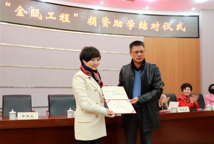 (人文系通讯员 林文龙)11月29日下午,第14届“金瓯工程”捐资助学结对仪式在我院正德楼罗山厅隆重举行。学院党委副书记夏晓军,鹿城区妇联副主席林盈盈,鹿城区女企业家协会会长郑莱莉、常务副会长朱彩霞以及各女企业家及受资助学生出席了结对仪式。