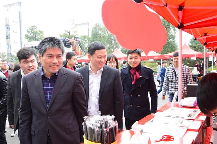 KAB全国推广办公室秘书长魏和平出席了本次活动并致辞,学院院院长谢志远、罗阁郎集团副总裁崔昆、春华教育集团董事黄霜叶等一行领导亲自到来摊位前,与同学们亲切的交流,并了解同学们的销售情况。
