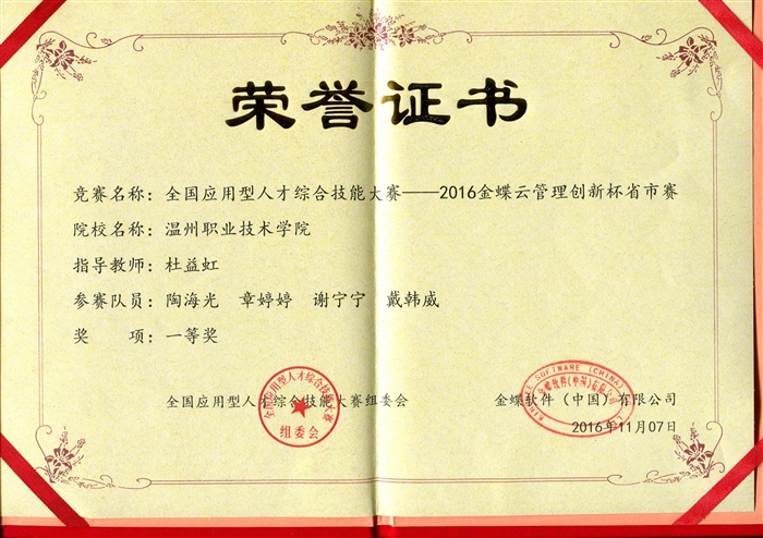 近日,全国应用型人才综合技能大赛组委会、金蝶软件(中国)有限公司公布了2016金蝶云管理创新杯大赛华东赛区分赛成绩。我院信息技术系软件与信息服务专业参赛的七支队伍全部获奖,分别获得两个一等奖,五个二等奖。其中,由杜益虹老师指导的陶海光、戴韩威、章婷婷组成的“互+超越”队和池万乐老师指导的周雨情、王胤萱、郑双双组成的“创新”队获得了华东赛区一等奖。由翁正秋老师指导的倪成持、高福星、孙静、夏毅芬组成的“一大”队,施郁文老师指导的黄小慧、余秀君、姜露、周青鹏组成的“云之剑”队,龚大丰老师指导的陈德枫、施建朋、钱克栋、陈灵巧组成的“探索者”队,陈清华老师指导的单丁炯、上官菲菲、吴文君、王洁翔、王昌图组成的“挑战者”队,郑倩嫣老师指导的周加城、吴云月、王培培组成的“腾云”队分别获得华东赛区二等奖。通过比赛,参赛选手也更深入地了解企业各个业务单元及其相互关系,明晰了互联网+教育时代企业到底需要怎样的人才?