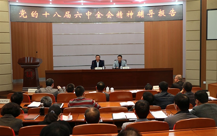 为深入学习宣传贯彻党的十八届六中全会精神,深刻领会六中全会精神的实质和丰富内涵,12月21日下午,院党委邀请温州市政协主席余梅生来我院作十八届六中全会精神辅导报告。院领导班子,学院全体中层干部、各党支部书记、思政辅导员、党务部门工作人员等聆听了报告。报告会由党委书记王靖高主持。