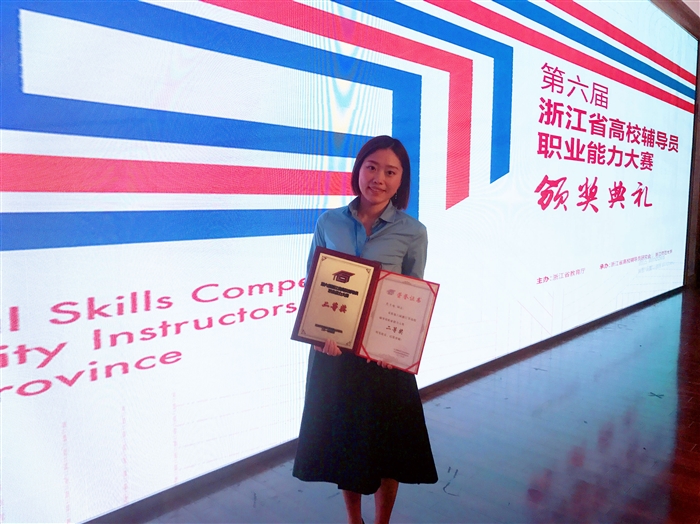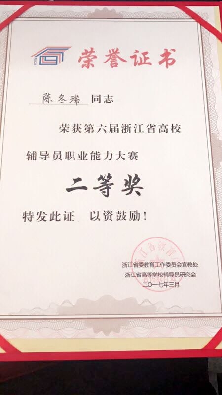 第六届浙江省高校辅导员职业能力大赛分为初赛、复赛和决赛三个阶段。初赛由各个高校自行组织,选派优秀辅导员参加复赛;复赛设基础知识测试(网文写作)、主题班会和案例分析三个环节;决赛则包括谈心谈话和主题演讲两项内容。陈冬瑞凭借个人出色的职业能力素质,扎实的理论知识和丰富的工作经验积累,展现了我院辅导员出色的个人素质和工作能力,在决赛中沉着应对,最终荣获二等奖。