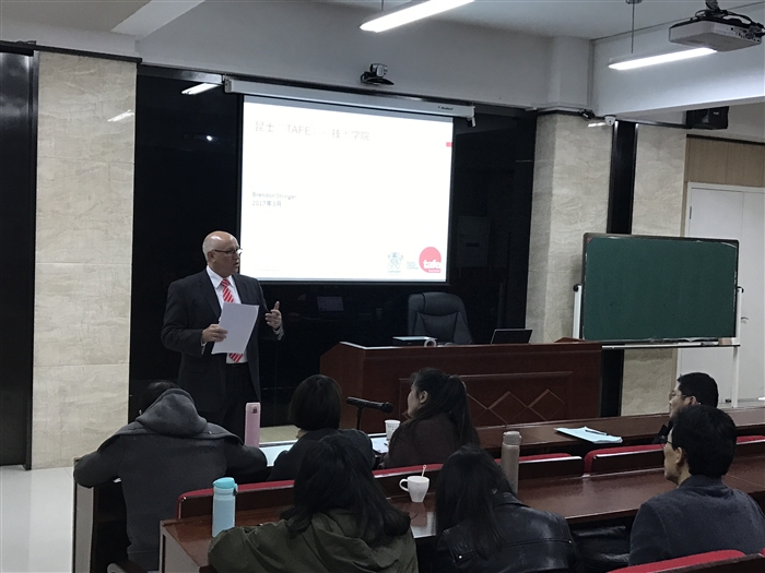 在教师发展中心,Brendon先生给信息技术系教师介绍了代表澳洲职业教育体系特色的昆士兰TAFE职业教育学院的职业教育与培训体系,让我院教师们对合作项目有了更深刻的了解;在信息技术系会议室,Brendon先生详细介绍了合同管理流程,并与软件专业教师们探讨了合作项目课程教学和学生交流学习项目细节。