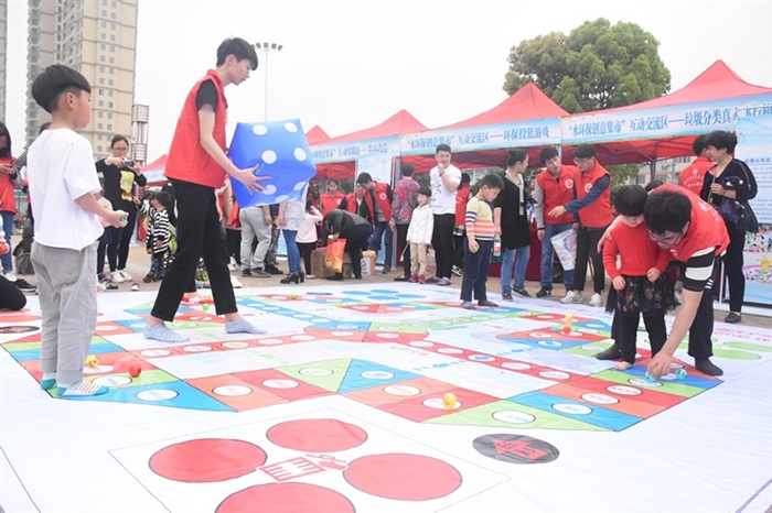 “水环保创意集市”集惠民服务、环保宣传、爱水护水行动于一体,既宣传了“五水共治”的相关知识,也服务了群众。在水环保创意集市现场,惠民服务区、互动交流区、行动实践区、风采展示区有序排开。在集市的惠民服务区现场,人文系的“拍摄治水全家福”吸引了许多居民,许多家庭全家总动员一起参与治水行动,并与志愿者们分享治水的故事。互动交流区现场,水环保知识问答、垃圾分类游戏、以物换绿等活动如火如荼举行,现场的居民们热情地参与互动活动,其中“飞行棋垃圾分类游戏”、“垃圾分类投篮游戏”吸引了现场不少小朋友的积极参与,居民们在游戏互动中放松了心情、了解了治水相关知识;在行动实践区,广场中央一幅正在绘制中的百米画卷吸引了居民驻足观赏,画卷旁红领巾“河小二”们或蹲、或跪、或趴,用手中的画笔,绘制出他们心中的治水蓝图。在风采展示区,时尚设计系的志愿者们利用废弃的报纸、编织袋设计制作出一件件创意、时尚的服装,大学生志愿者模特身着创意服饰,向当地居民传达环保的理念、节约的理念和废物再创造的智慧和技能。此外,建筑工程系“河长”巡护队“河小二”志愿者们兵分三路,开展沿河垃圾清理、跟着“河长”去巡河、水质监测等项目。