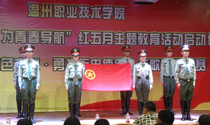 学院国旗护卫队迈着铿锵有力的步伐,举着鲜艳的团旗来到了主席台中央,全体青年朋友面朝团旗,高举右拳,重温了入团誓词,再次接受了一次思想洗礼。
