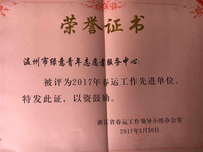 (建工系通讯员 吴鹏达)日前,浙江省春运工作领导小组根据2017年全省春运工作情况,对先进单位和先进个人进行通报表彰。我院建筑工程系师生共同创立的温州市绿意青年志愿者服务中心荣获“2017年春运工作先进单位”的称号。
