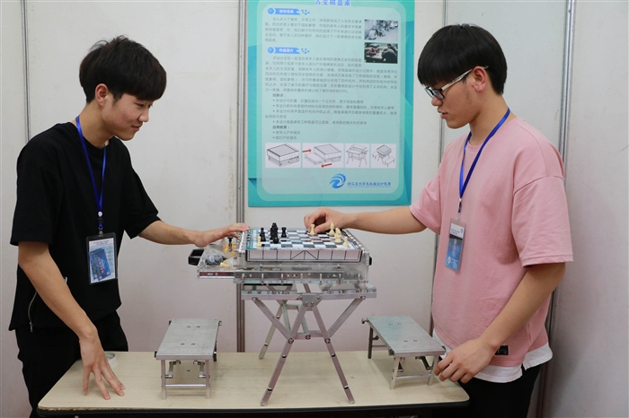 而我院机械系另外一个研发团队所设计的“声控智能翻书机”却为一些双手不方便的残障人士解决了看书读报的不便。该作品设计者、我院汽摩零部件制造专业大二学生周文彬同学说:“我们在设计过程中运用了齿轮机构、槽轮机构、快调稳压机构、带轮传动、锥齿轮机构、凸轮滑块机构、连杆机构等原理,结合了语音控制系统,实现了书本的搓起、夹持、翻页、压紧等功能。把平时课堂所有的机械原理,通过作品展现出来。”在比赛现场,还发现许多很有创意的作品,如“全自动穿裤机”、“百变棋盘桌”等。