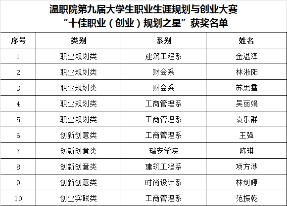 附:温职院第九届大学生职业生涯规划与创业大赛“十佳职业(创业)规划之星”获奖名单