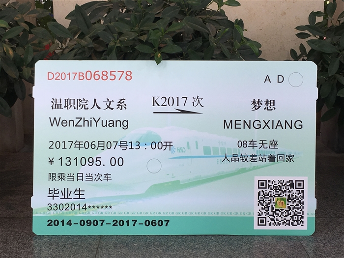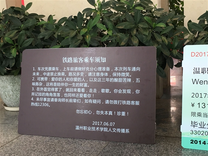 在毕业典礼现场,人文系的过道和走廊布置了“致青春”、“那些年”等字样的KT版,大幅的喷绘映出每个班的毕业照,整个会场布置衬托着毕业离别的氛围。几张放大的创意火车票和机票,起点是温职院人文系,终点是梦想;“开车时间”和“起飞时间”是2017年6月7日。 所有的装扮,都是希望毕业生们能够把大学的结束当做一个新的起点,从这里启航,通往梦想中的下一站,表达了师生们对毕业生的一种祝福,祝福和纪念他们人生最宝贵的时光。