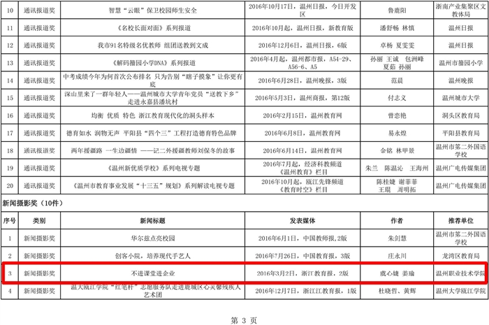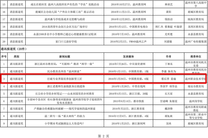 本网讯 日前,2016年度温州教育新闻奖评选结果揭晓,我院获得三个奖项,为获奖数最多的高校。