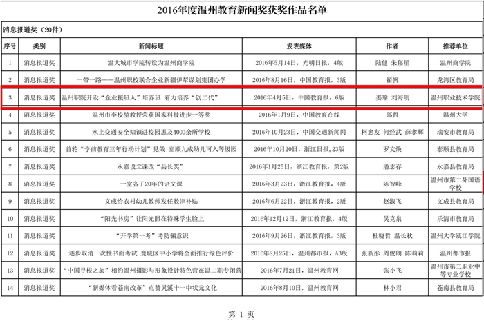 我院报送的《温州职院开设“企业接班人”培养班 着力培养“创二代”》荣获消息报道奖,报道了我院一个特殊班级——“企业接班人”培养班的特色和亮点;《打破专业界限培养创新型工匠》荣获通讯报道奖,讲述了我院实施的一个教学改革试点班级的具体情况;《不进课堂进企业》荣获新闻摄影奖,该新闻图片展现了开学伊始,我院的20多位大学生利用课余时间深入企业一线进行实习的景象。