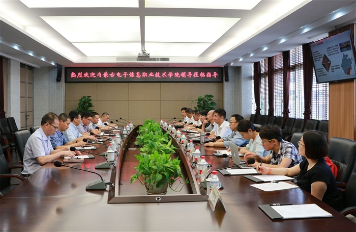 9月19日上午,内蒙古电子信息职业技术学院党委书记张鹏宇一行来我院交流,我院党委书记王靖高与相关部门负责人热情接待了来访客人。双方于研创大楼三楼会议室举行座谈交流,就我院党建工作情况,改革发展总体情况,院系两级管理等工作展开探讨交流。张鹏宇一行还参观了我院实训基地、图书馆、技术研创大楼等。