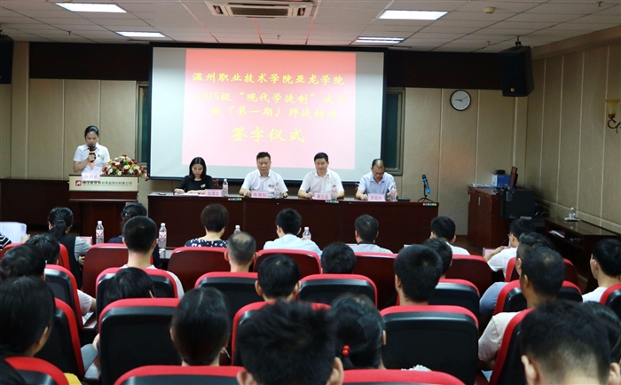 会上,企业导师与试点班学生签订了“现代学徒制”师徒结对协议书。温职院亚龙学院2015级“现代学徒制”试点班学生代表王春港、亚龙教育企业师傅代表吴成海、学校代表苏绍兴分别作代表发言,表达了决心,畅想了前景。
