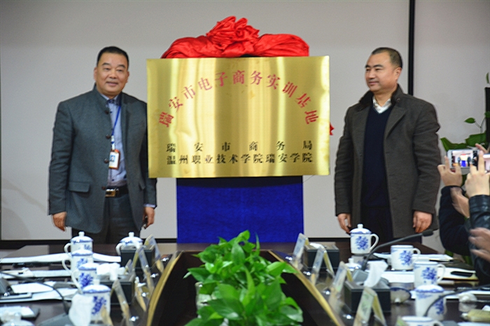 在仪式上,我院瑞安学院院长谷智静与苏正旺、浙江鸿一箱包皮件有限公司等7家知名企业签订电子商务产教融合校企合作协议。并进行了瑞安市电商实训基地揭牌仪式。