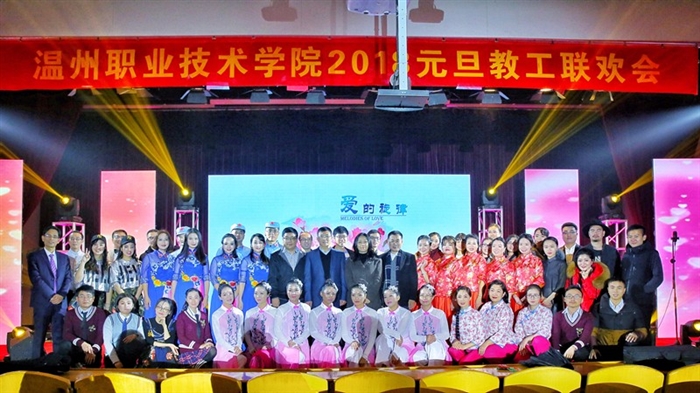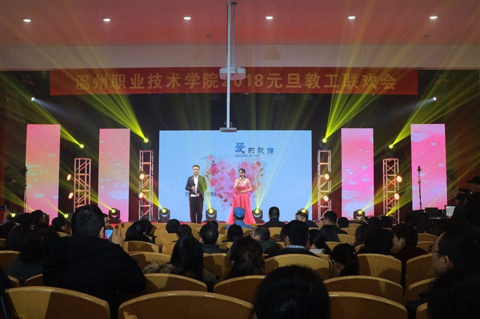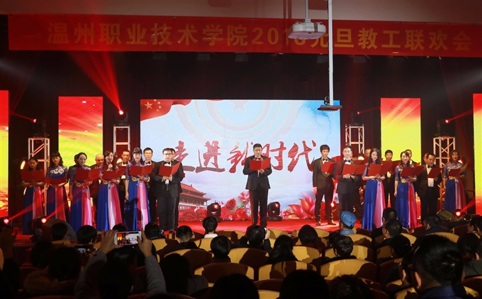 联欢会在王靖高致辞中拉开帷幕。王靖高回顾了2017年学院取得的各项成绩和获得的各项荣誉,并代表学院党政班子向广大师生员工致以节日的问候和新年的祝福。王靖高指出,2018年是中国改革开放40周年,是全面落实十九大精神的开局之年,也是我院建设浙江省重点高职院校的关键之年,我们要全面贯彻党的十九大精神,以习近平新时代中国特色社会主义思想为指导,以“十三五”发展规划为总纲,大力推进党的建设、重点校建设和治理体系建设。王靖高希望全院师生在新的一年里,不忘初心,牢记使命,努力创建全国高水平高职院校,为打造全国产教融合的典范、新技术应用人才培养的典范、技术应用与服务的典范,引领中国高职教育改革和发展提供“温州方案”和“温州经验”。
