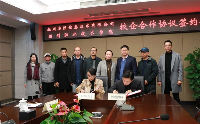 (信息技术系通讯员 吴淑英)2018年1月2日,新年的第一个工作日,我院与杭州安恒信息技术有限公司在学院技术研创大楼会议室隆重举行了杭州安恒信息技术有限公司与温州职业技术学院校企合作协议签约仪式。我院院长谢志远、杭州安恒信息技术有限公司董事长范渊、我院副院长王志梅、安恒大学校长唐兆希等安恒公司相关领导、我院信息技术系主任田启明等相关师生参加了签约仪式。仪式由田启明主持。