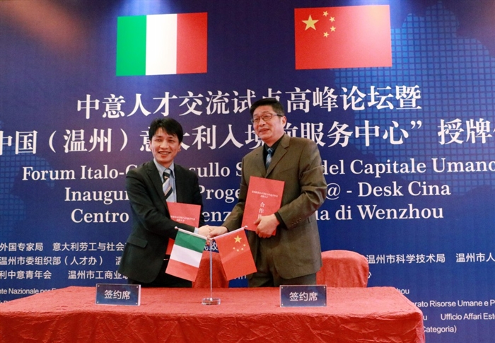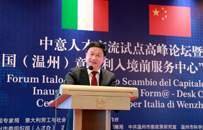 (外事办通讯员 王若翔)2018年1月5日下午,由国家外国专家局、意大利劳工与社会政策部、温州市人民政府共同主办的中意人才交流试点高峰论坛暨“中国(温州)意大利入境前服务中心”授牌仪式在香格里拉大酒店举行,来自意大利驻沪总领事馆、意大利高校联合研究中心、国家外国专家局、温州各大高校、行业协会、企业家代表等各界人士出席活动。我院院长谢志远受邀作主旨发言。
