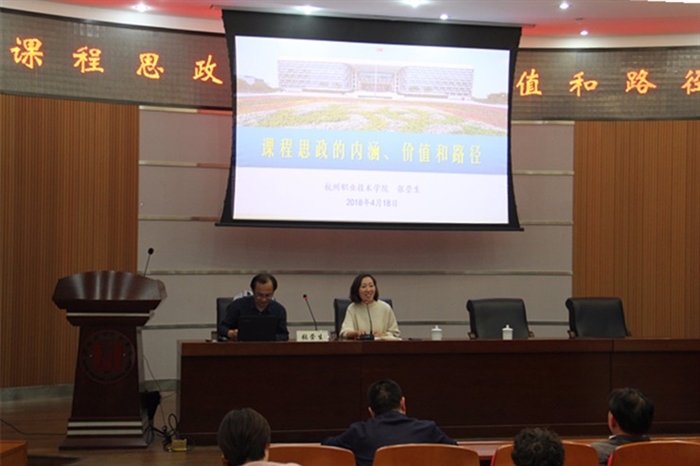 讲座中,张崇生首先追根溯源,从理论角度阐述了什么是“课程思政”,并介绍了上海部分高校、杭职院的特色做法。接着,他向与会的专业教师们抛出四个问题,引导大家深入思考“课程思政”的必要性和重要性,并从5个方面进行了归纳总结。最后,张崇生从抓好顶层设计、破除认识误区、明确原则方法、全校层次推进、加强具体指导等5个方面阐述了推进“课程思政”工作的路径和载体。