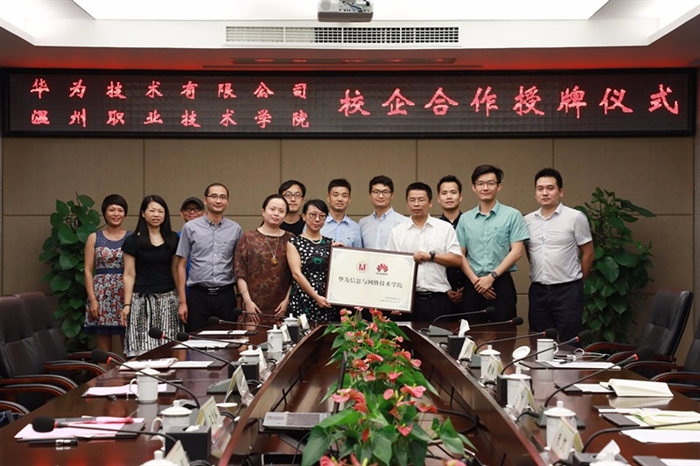 (信息技术系通讯员 吴淑英)7月4日下午,我院与华为技术有限公司在学院技术研创大楼会议室隆重举行了授牌仪式,我院接受华为技术有限公司授牌,双方合作成立“华为信息与网络技术学院”(简称:ICT学院)。我院副院长王志梅,华为浙江区域交付与服务部部长盛宇才、华为企业业务温州市总经理朱凯,我院信息技术系主任田启明、副主任黄河及教师代表参加了签约仪式。仪式由田启明主持。