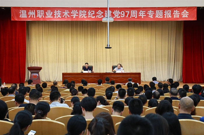 本网讯 7月9日,我院在树人堂召开庆祝建党97周年专题报告会,特邀原温州市委宣传部常务副部长、正泰集团党委书记林可夫作专题报告。学院全体党政班子成员、全体中层干部、全体党员参会聆听。报告会由党委书记王靖高主持。