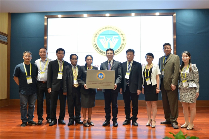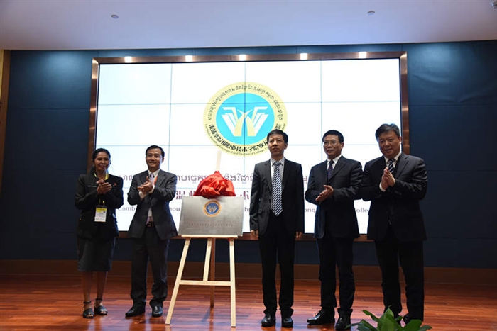 会上,司桑南、于永明、何索陈、王靖高、陈继权共同为柬埔寨温州职业技术学院亚龙丝路学院揭牌。
