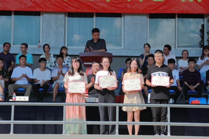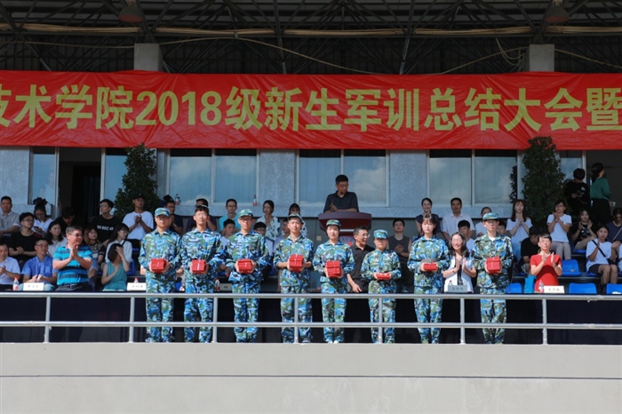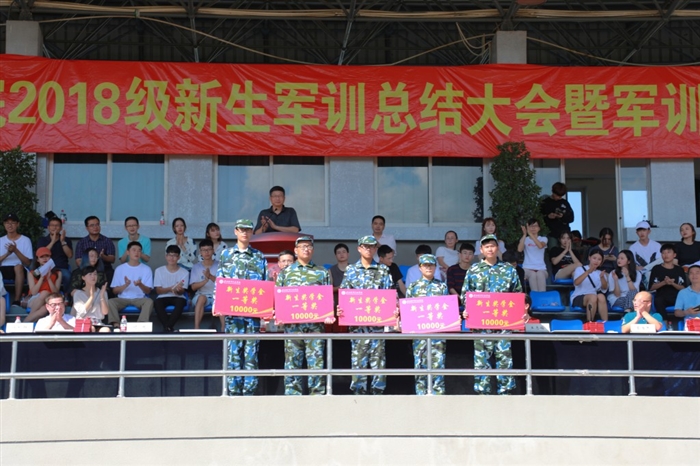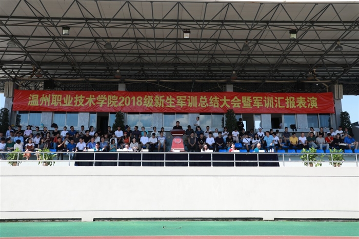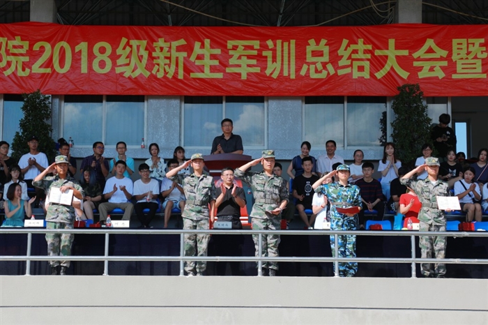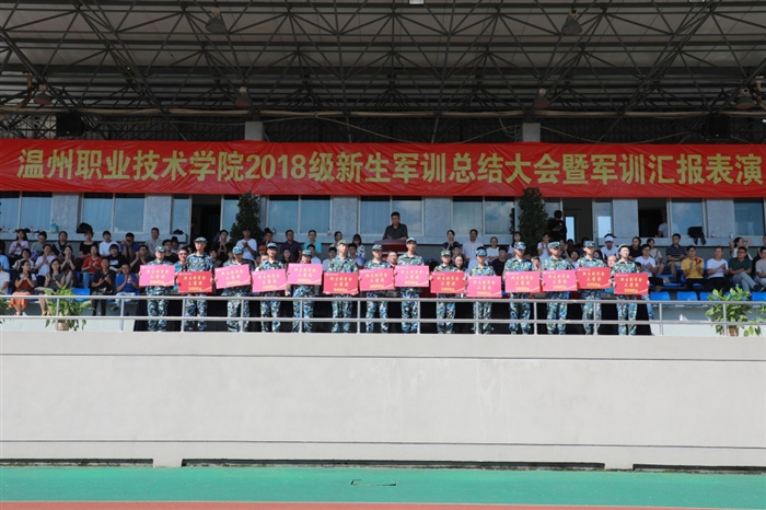军训汇报表演结束后,学院副院长王向红宣读《关于表彰温州职业技术学院2018级学生军训先进集体和先进个人的通知》和《关于表彰温州职业技术学院2018级新生奖学金获得者的通知》等文件,主席台就座领导为获奖人员颁发证书。