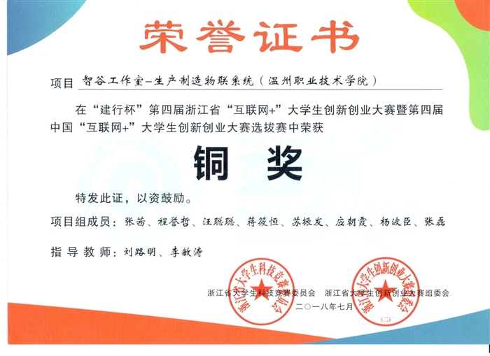 在本届浙江省“互联网+”大赛中,我院首次实现了跨院校、跨专业、跨地域的合作,由余胜东老师指导,黄铖、张良同学与温州医科大学国际教育学院共同打造的作品《基于互联网控制的工业机器人柔性制造系统》荣获银奖;由余胜东、马金玉指导,孔高阳、沈雪杰、戴彬炳等同学的作品《高端智能装备定制专家》荣获银奖;由刘路明、李敏涛指导,张茜、程誉哲、汪聪聪等同学的作品《智谷工作室—生产制造物联系统》荣获铜奖。