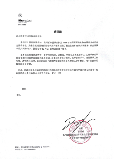 信中说到,“温州喜来登酒店作为法国国际美食协会温州分会的指定接待单位,为来自五湖四海的协会代表和要员提供了餐饮住宿和会议多种服务。在本次重要接待过程,贵院的张坚、谢伟豪、罗颜、杨展瑜等22名同学在会议前筹备期间积极参加技能和服务培训,工作过程中充分发挥了其学识和才干,自觉服从工作安排,遵守酒店纪律,他们表现出了高度敬业精神和出色的团队合作意识,为本次会议的接待作出了贡献。”